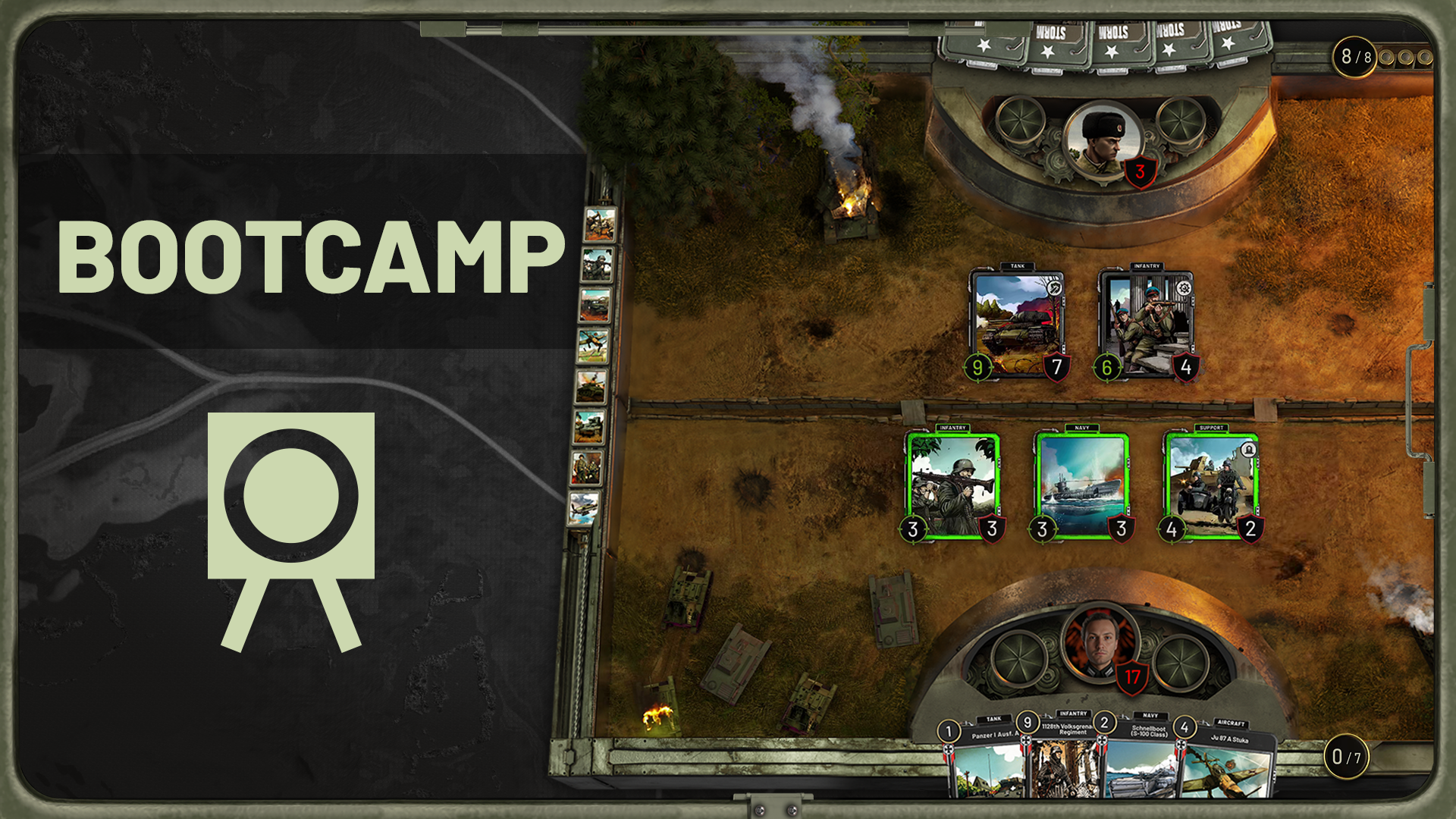 Boot camps are educational single scenarios where players are to fight in scenarios where they face AI-driven opponents with distinct strategies in any way they want. The players having trouble against opponents with certain archetypes will be able to play and understand the strengths and weaknesses of strategies without the risk of frustration of playing against real players. Boot Camps will have 5 branches for 5 different Factions, with each match getting harder and harder.