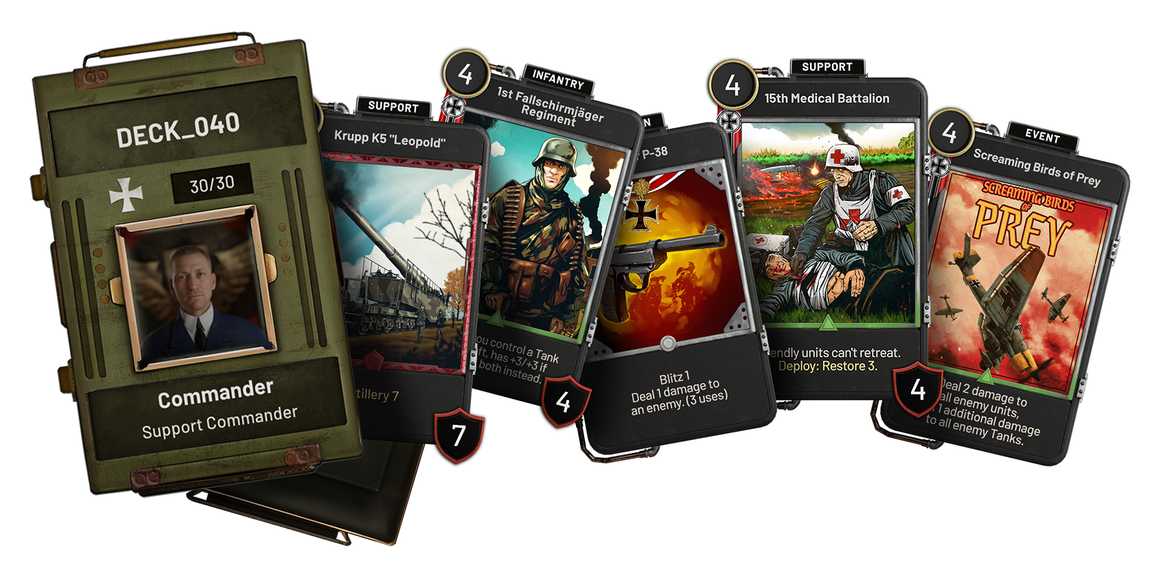 A Storm Warfare deck is built around a combination of military units to support the battle strategies of their Commander. Based on a given battle strategy, players will build their decks using a variety of Units, Events, Weapons, and Heroes. The Deck is a collection of 30 cards assembled before a match, and it is the platform on the board from which players draw cards during game play.
